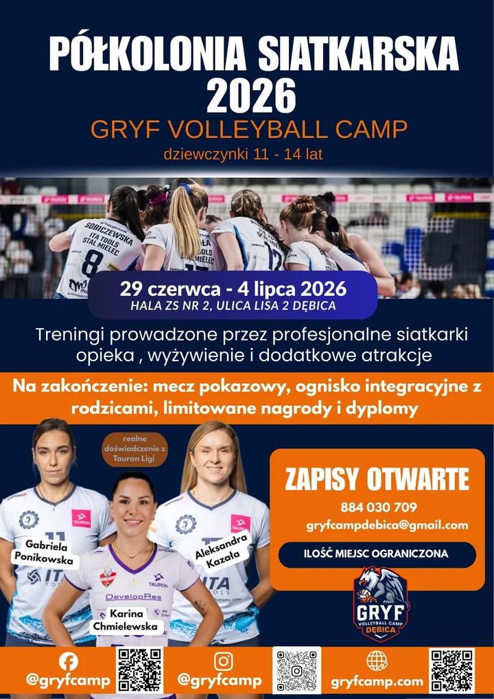 Startują zapisy na tygodniowe półkolonie siatkarskie Gryf Camp Dębica — treningi z profesjonalnymi zawodniczkami, technika, taktyka i dużo sportowej zabawy. Dołącz do nas na tydzień pełen emocji i pracy nad umiejętnościami na boisku!